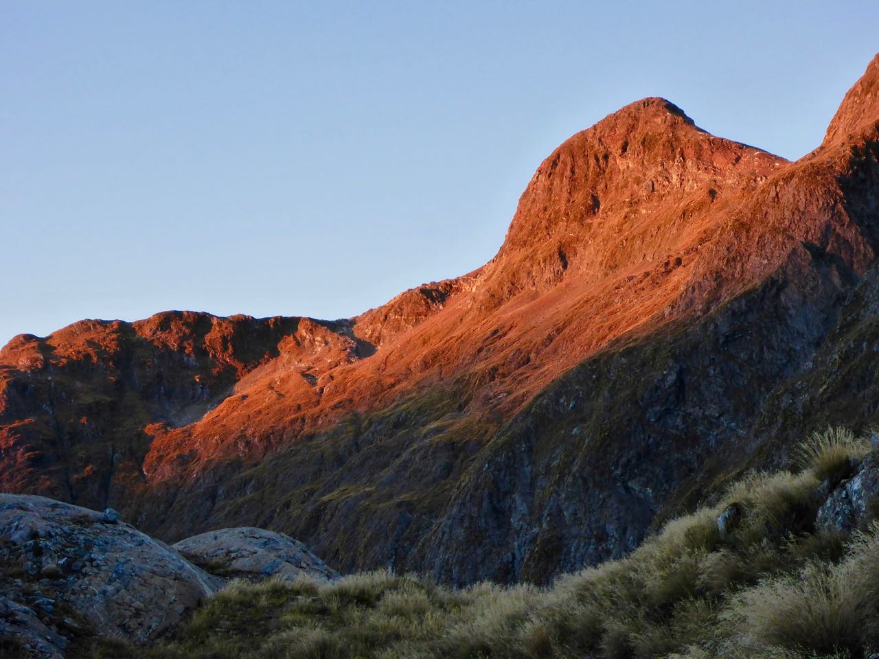 Another clear sunny day greeted us the next morning. An ephemeral, red alpenglow crept across the surrounding peaks as we prepared to leave. An easy tramp around the lake took us to the tussock slope leading to lake 1100m. Here we launched our packrafts at the stream outlet and paddled up the still waters to a gully near the head. The lake was windstill with unblemished reflections of the surrounding peaks.